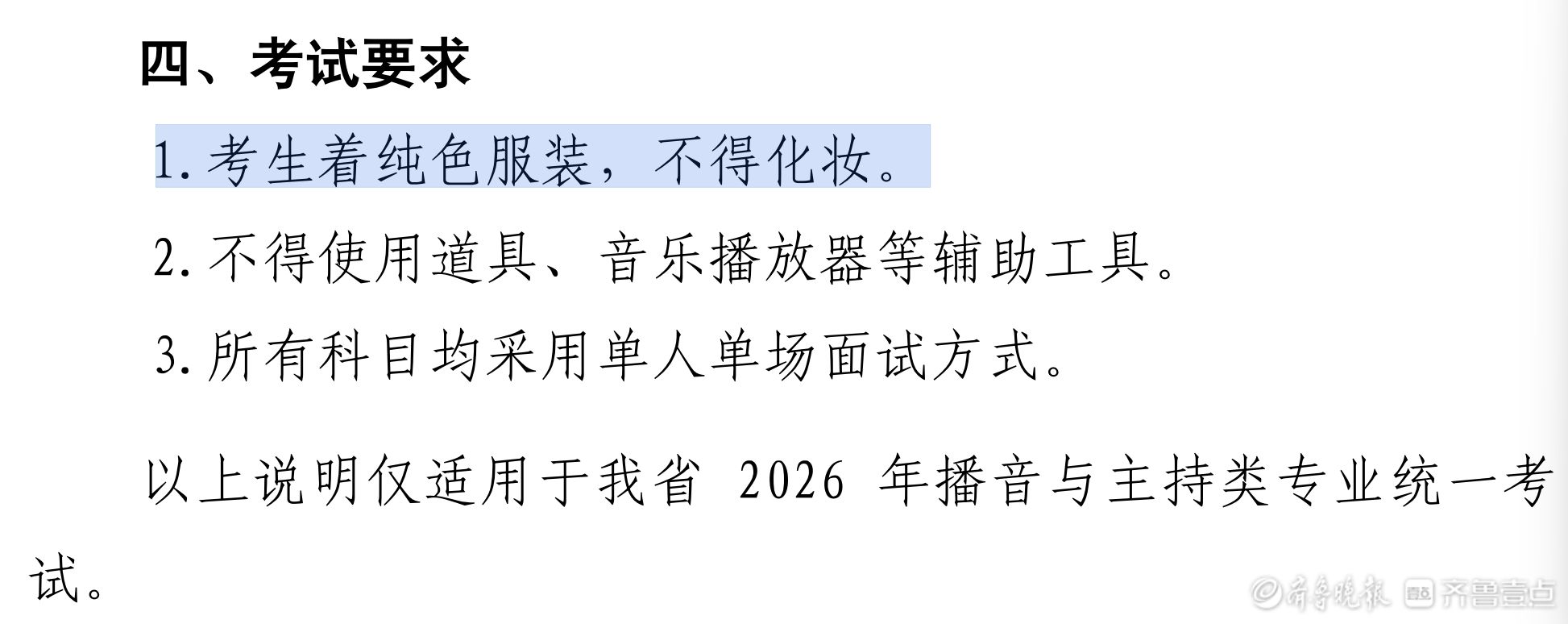 比如,2025年播音与主持类专业要求“不得出现可能影响客观评判的化妆、遮挡面部、佩戴饰品等行为”,2026年则干脆要求考生“着纯色服装,不得化妆”。音乐类专业也首次提出同样要求。舞蹈类专业则要求考生“不得化妆”。记者注意到,在往年播音与主持、舞蹈类专业考试过程中,曾经出现过考点工作人员要求考生在等待考试期间擦掉妆容的做法。