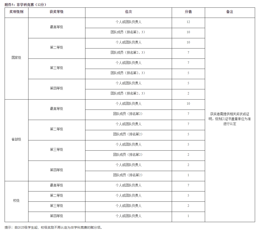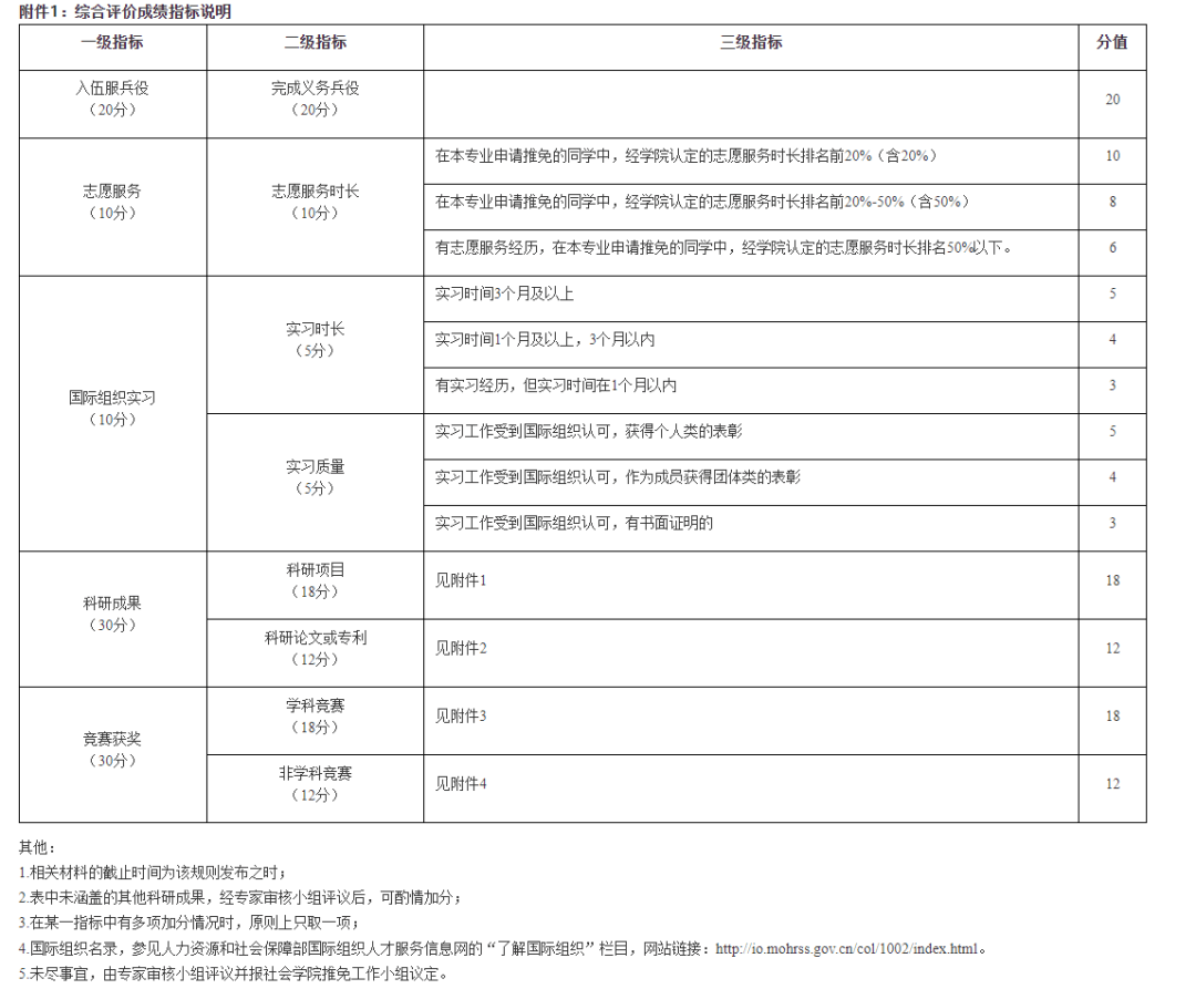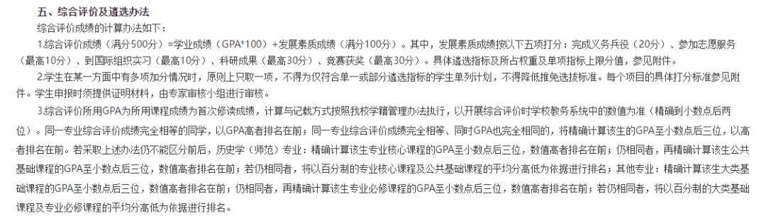 其中,发展素质成绩按以下五项打分:完成义务兵役(20分)、参加志愿服务(最高10分)、到国际组织实习(最高10分)、科研成果(最高30分)、竞赛获奖(最高30分)。