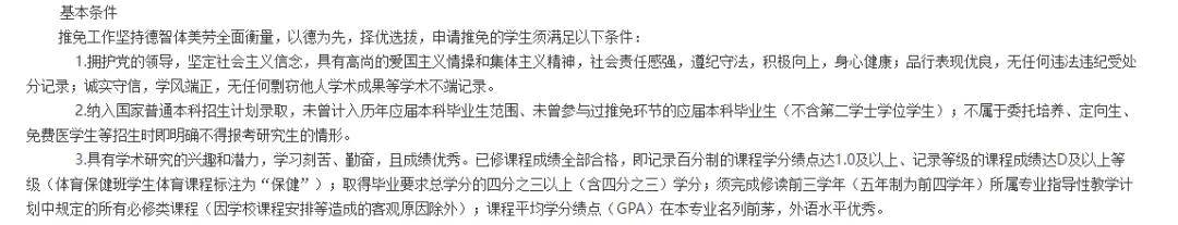 取得毕业要求总学分的四分之三以上(含四分之三)学分;须完成修读前三学年(五年制为前四学年)所属专业指导性教学计划中规定的所有必修类课程(因学校课程安排等造成的客观原因除外);课程平均学分绩点(GPA)在本专业名列前茅,外语水平优秀。