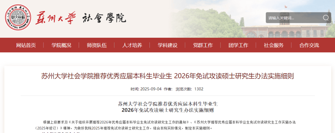 2025年9月,苏州大学各学院发布了2026届推荐优秀应届本科毕业生免试攻读硕士工作的相关通知。