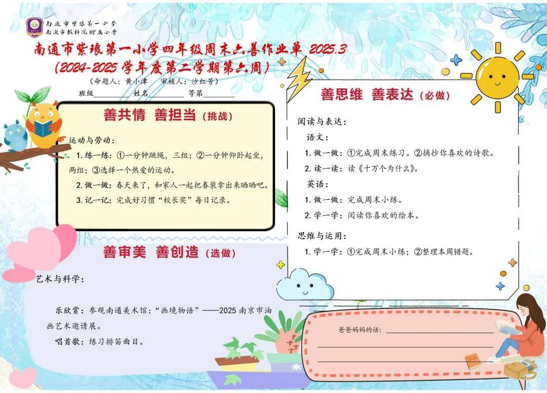 面对学科作业叠加导致的学业负担过重、统一作业难以适配不同水平学生、教师批改不及时影响完成效能这三大作业管理难题,紫琅一小构建评价引领的“六善”作业体系,围绕 “善思维、善表达、善共情、善担当、善审美、善创造” 六大维度,为不同学科、不同年段制定可操作、可感知的评价标准。