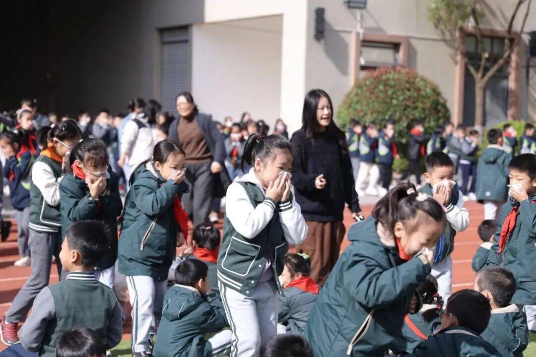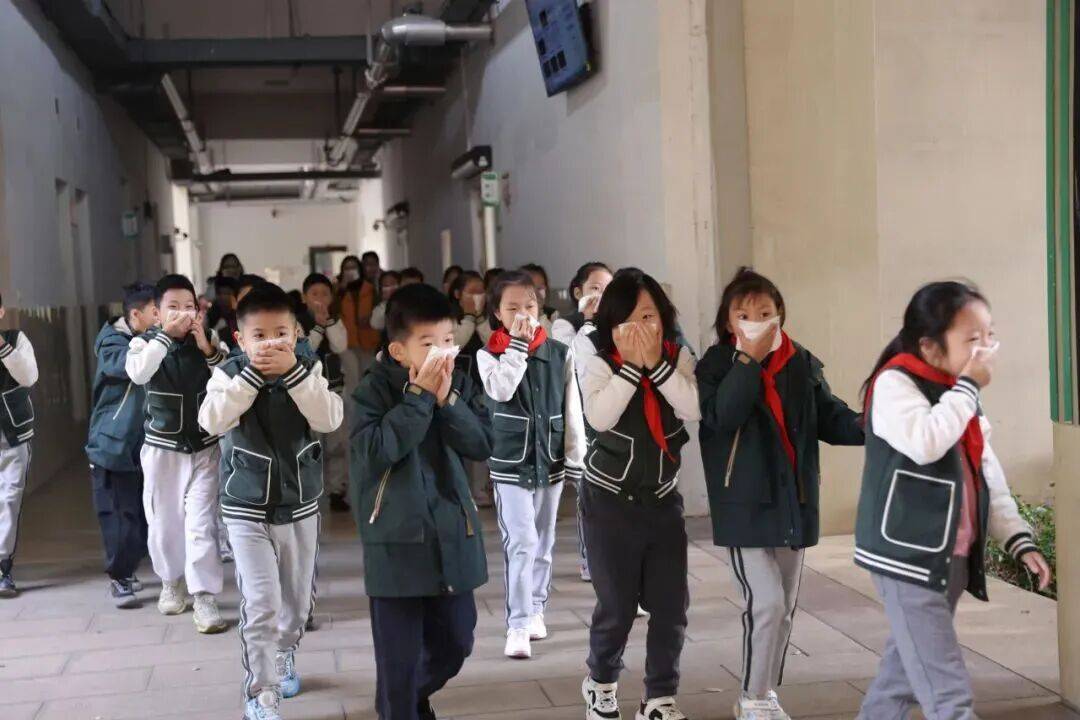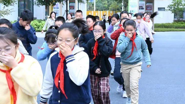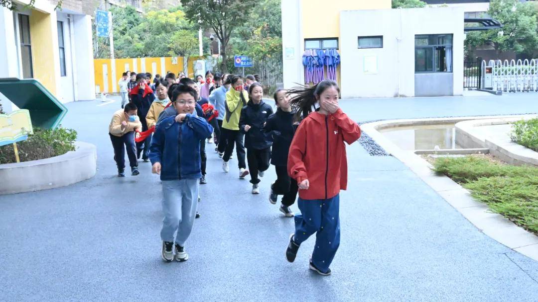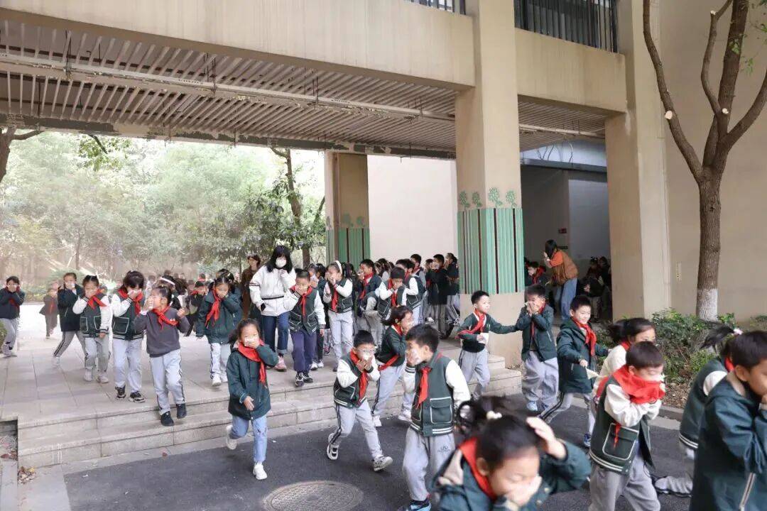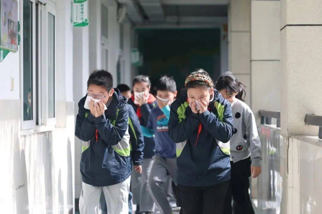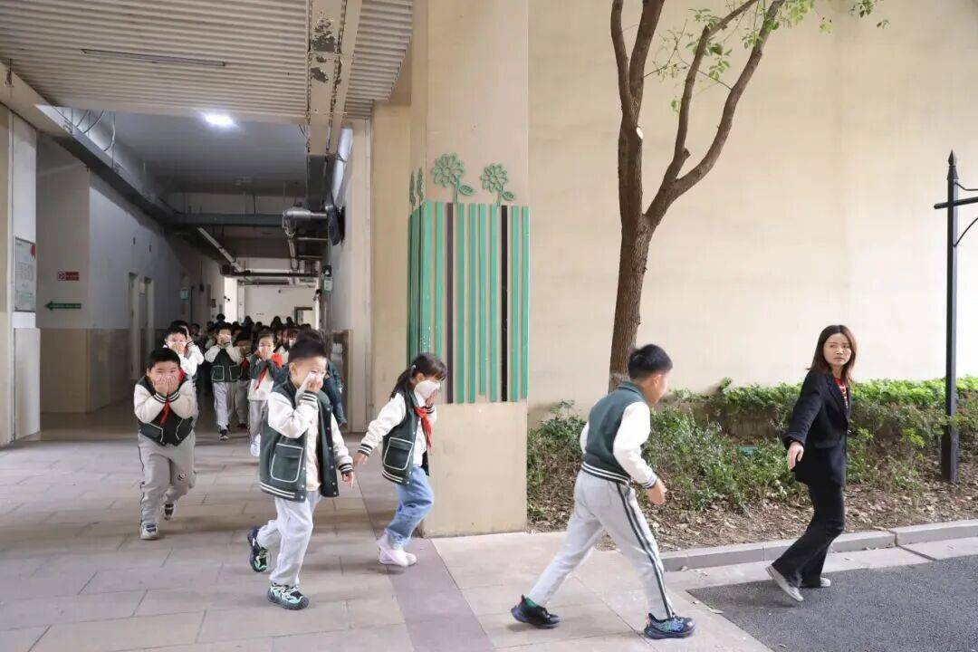 伴随着警报声,各班级学生在班主任和配班老师指挥下,按照消防应急疏散预案,弯腰低姿,沿着安全疏散路线,快速、有序地向学校操场安全地带撤离。各楼层、各路口均有教职工定点值守,疏导指引,确保撤离过程安全顺畅。全校师生全部安全抵达集结地点,做到了紧张而不慌乱,迅速而有秩序。
