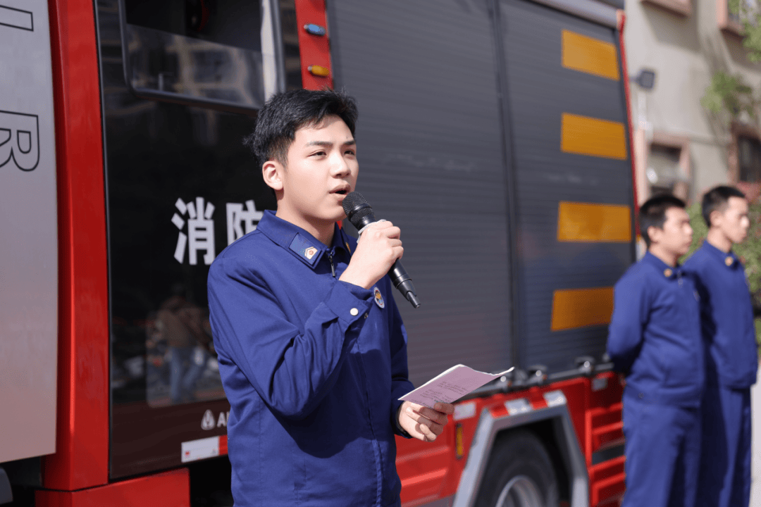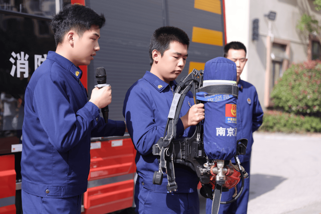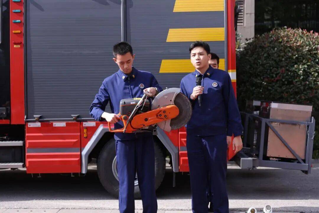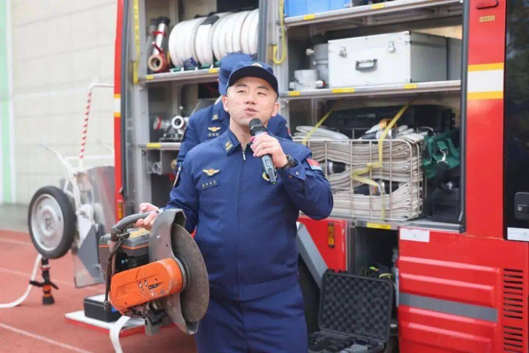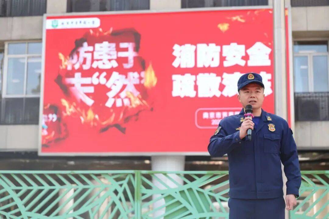 全体师生到达安全场地后,玄武消防大队讲师靳谌对本次演练进行总结。他首先表扬了全校同学疏散迅速有序,能按预案要求严格组织、规范实施、全员参与,整个演练活动达到了预期效果。随后,消防员邀请了几位同学上台,现场穿戴消防救援服装,学习灭火器的使用方式,进一步提高了大家紧急避险、自救自护的能力。