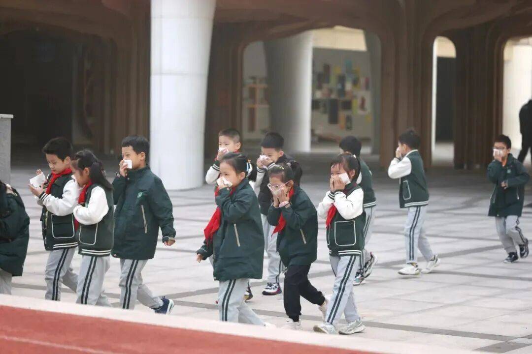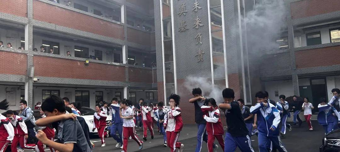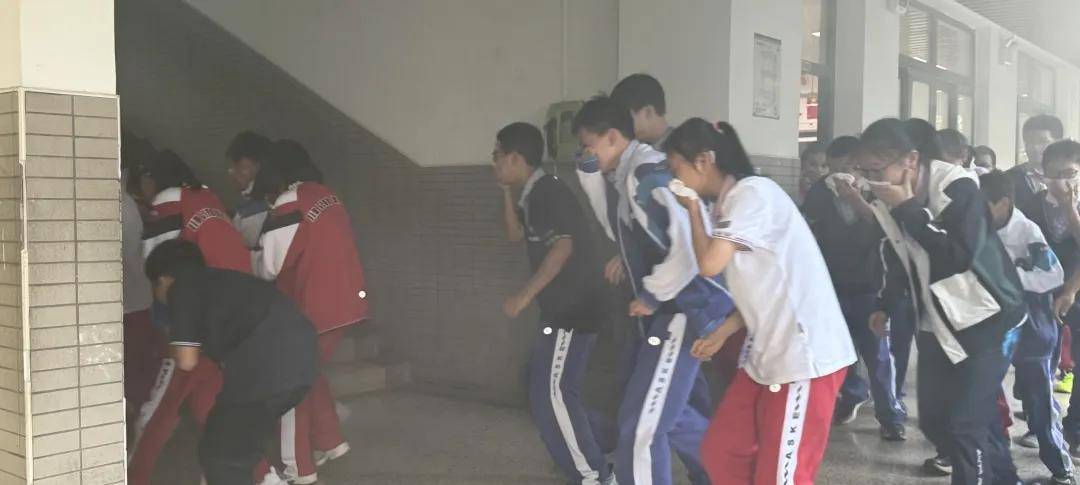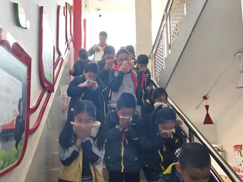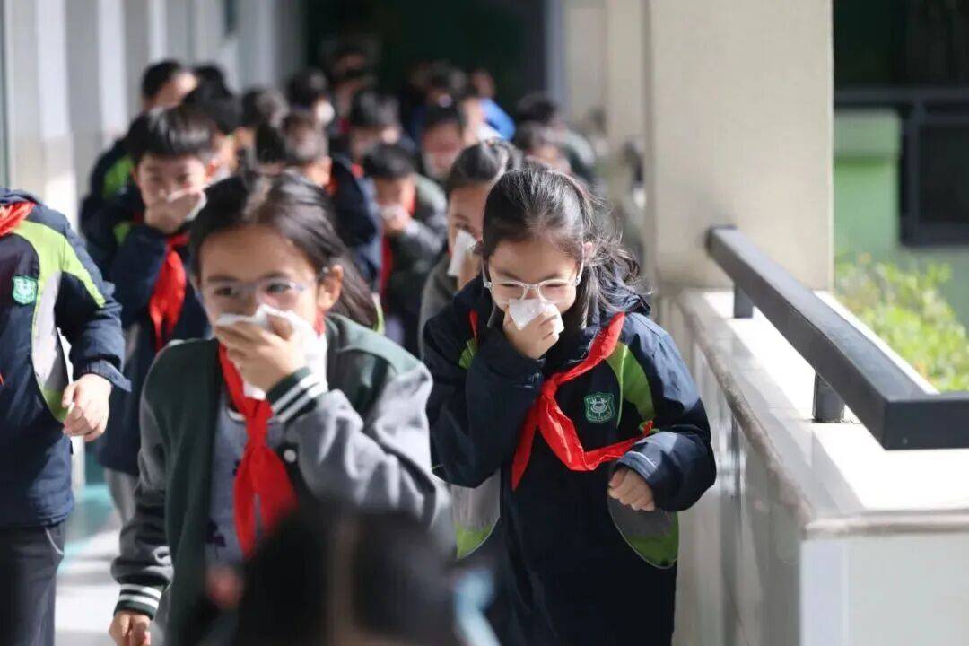 随着一阵急促的火警警报响起,同学们在班主任和配班老师的带领下有序疏散。校园教学楼每层楼梯口都有一名安全引导员老师在驻守,在老师们的指引下,同学们用打湿的毛巾捂住口鼻,弯腰扶墙,有序、安全进行疏散。全校师生在2分52秒内安全疏散到学校足球场。