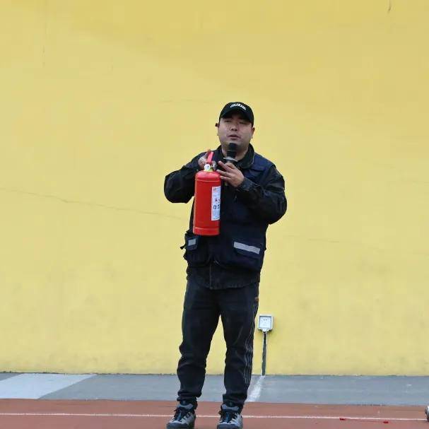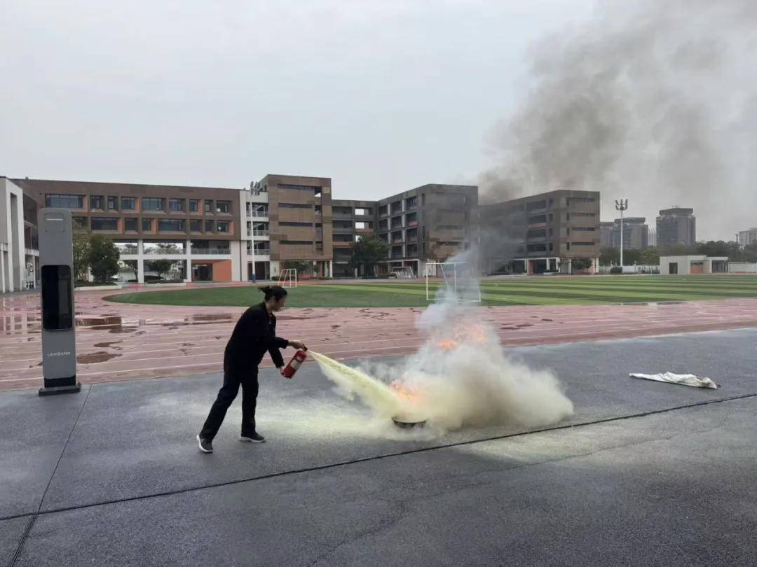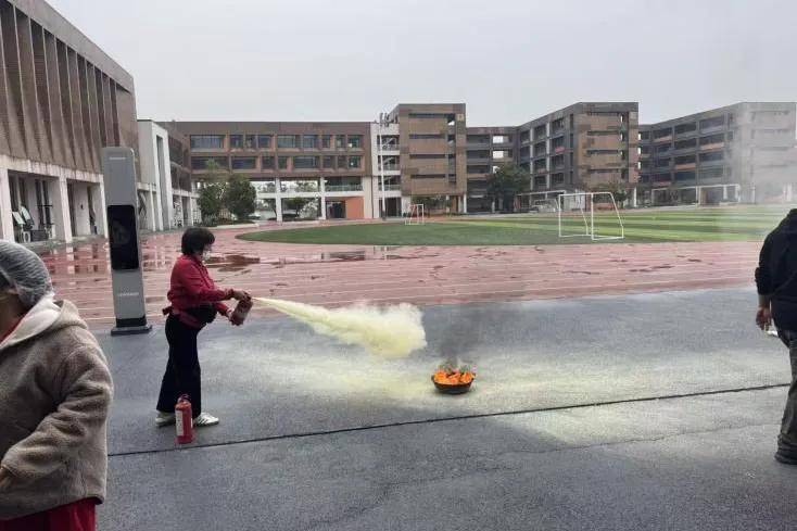 随后,全体后勤人员在教官的指导下,移步至学校空旷地带,进行了灭火器“提、拔、握、压”四步操作及灭火毯的实操演练。从食堂厨师到保安、保洁,大家纷纷上阵,亲身体验如何使用灭火器迅速灭火。整个过程紧张有序,参训人员态度认真,操作规范,确保了在突发火情时,这支“一线保障队伍”能够第一时间做出有效处置,成为守护校园安全的首道坚实屏障。