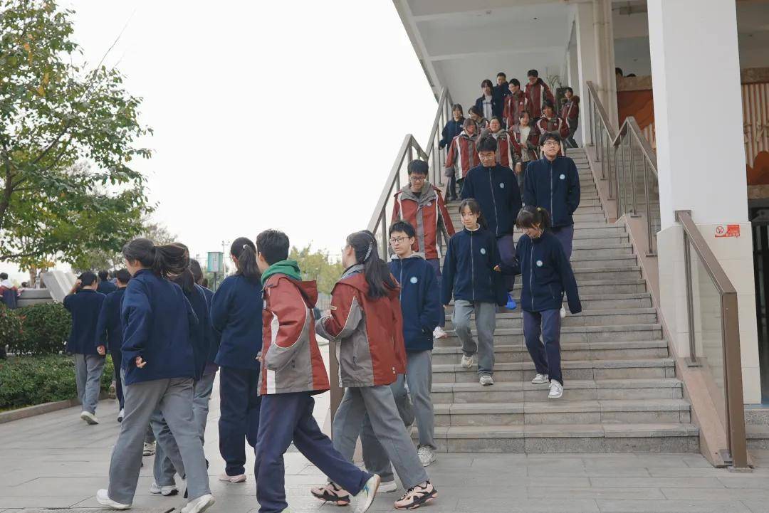 当日下午,校本部初一年级演练接续展开。从警报发出到全员撤离至安全区域,整个过程衔接流畅、动作标准统一:学生们反应迅速、听从指挥;班主任全程跟进,及时协助需要帮助的同学。两场演练均实现了“快速、安全、有序”的预期目标,有效检验了应急预案的可行性,也体现出师生较高的应急素养与协同意识。
