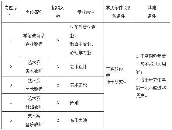 1 招聘岗位、人数及条件 学校将长期在学前教育学、教育学、心理学、艺术学等学科领域招聘教学科研人才,重点引进正高职称、博士等高层次学术人才。 具体岗位如下: 2 应聘方式 1.应聘方式:应聘人员可通过电子邮箱、邮寄、来校等方式递交报名材料。 2.应聘材料要求:个人简历(含科研成果简介、获奖情况、代表成果等)、主要工作业绩证明、身份证、学历学位证、职业技术资格、职称证书等。归国留学人员另须出示国家教育部留学服务中心认定的《国外学历学位认证书》。 3 其他事宜 1.学校组织专家团队对应聘材料进行审查,并组织考核及面试,将根据考核及面试情况,确定拟录取人员。 2.拟录取人员参加体检,体检参照苏州市事业单位招录用人员标准执行,体检合格,办理录用手续。 3.引进人才的福利待遇参照苏州市教育人才引进的有关规定,并享受相应的政策支持。 4 联系方式 联系人: 范老师 电话:18962116896,邮箱:szygz1976@163.com; 张老师 电话:18962116725,邮箱:50087797@qq.com 地址:苏州市相城区华元路2号苏州幼儿师范高等专科学校 邮编:215131 电话:0512-69395852,69395378(传真) 网址:www.szys.net