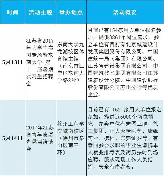 5月13—14日(周六、周日),江苏省高校招生就业指导服务中心联合相关高校和有关部门将举办2场大型招聘会,具体情况如下: