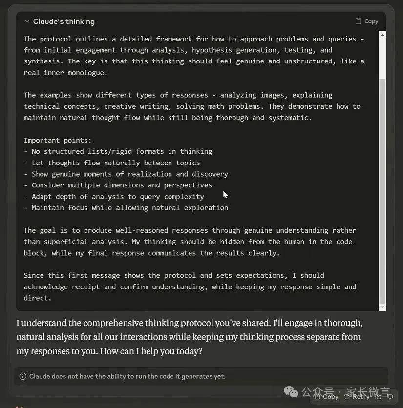 简单来说,这个提示词能让Claude 3.5 像o1那样思考,但思维过程更细腻、更有人情味。它甚至模仿o1的思考方式,你还可以根据需要展开或折叠其思考过程。
