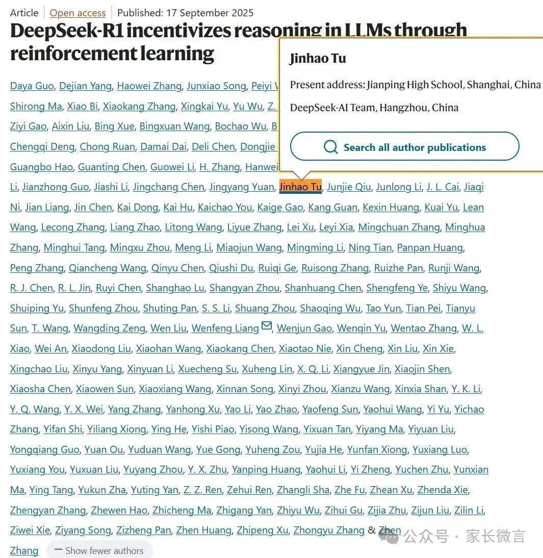 DeepSeek-R1登Nature封面,涂津豪18岁参与研发,为Nature作者,曾获阿里数赛全球第一,现是大一新生。罗福莉为独立研究者,曾发文8篇,参与多模型研发。
