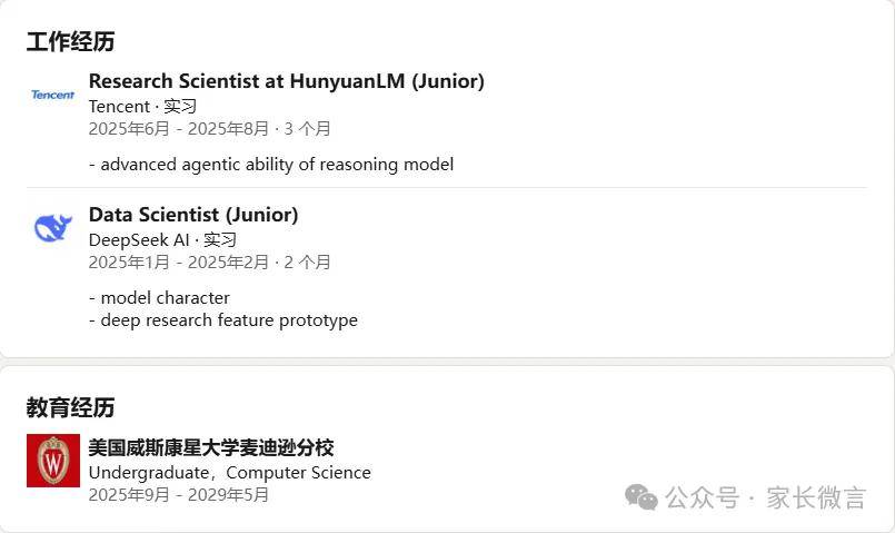 而就在今年寒假,他已经以实习生的身份加入 DeepSeek,深度参与了 DeepSeek-R1 的研发,为那篇Nature论文贡献了自己的力量。暑假又马不停蹄地走进腾讯,在混元大模型项目里继续发光发热。