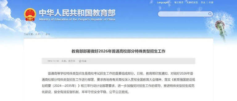 普通高等学校特殊类型招生是高校考试招生工作的重要组成部分。记者从教育部官网获悉,日前,教育部印发通知,对做好2026年普通高校部分特殊类型招生工作进行部署。