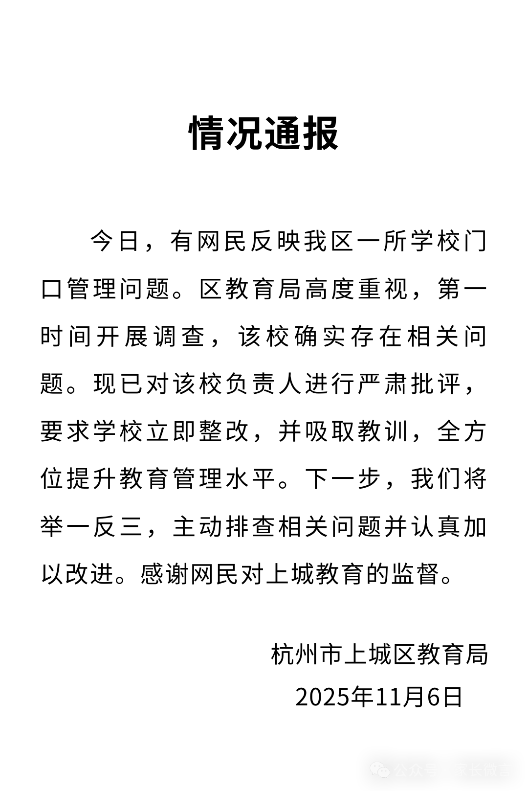 今日,有网民反映我区一所学校门口管理问题。区教育局高度重视,第一时间开展调查,该校确实存在相关问题。现已对该校负责人进行严肃批评,要求学校立即整改,并吸取教训,全方位提升教育管理水平。下一步,我们将举一反三,主动排查相关问题并认真加以改进。感谢网民对上城教育的监督。