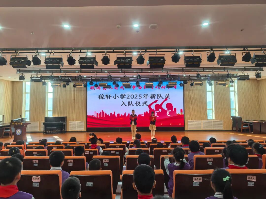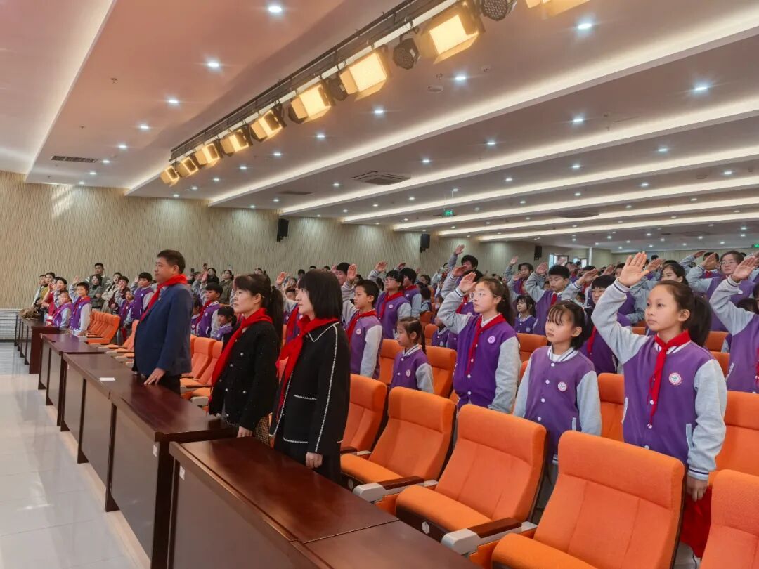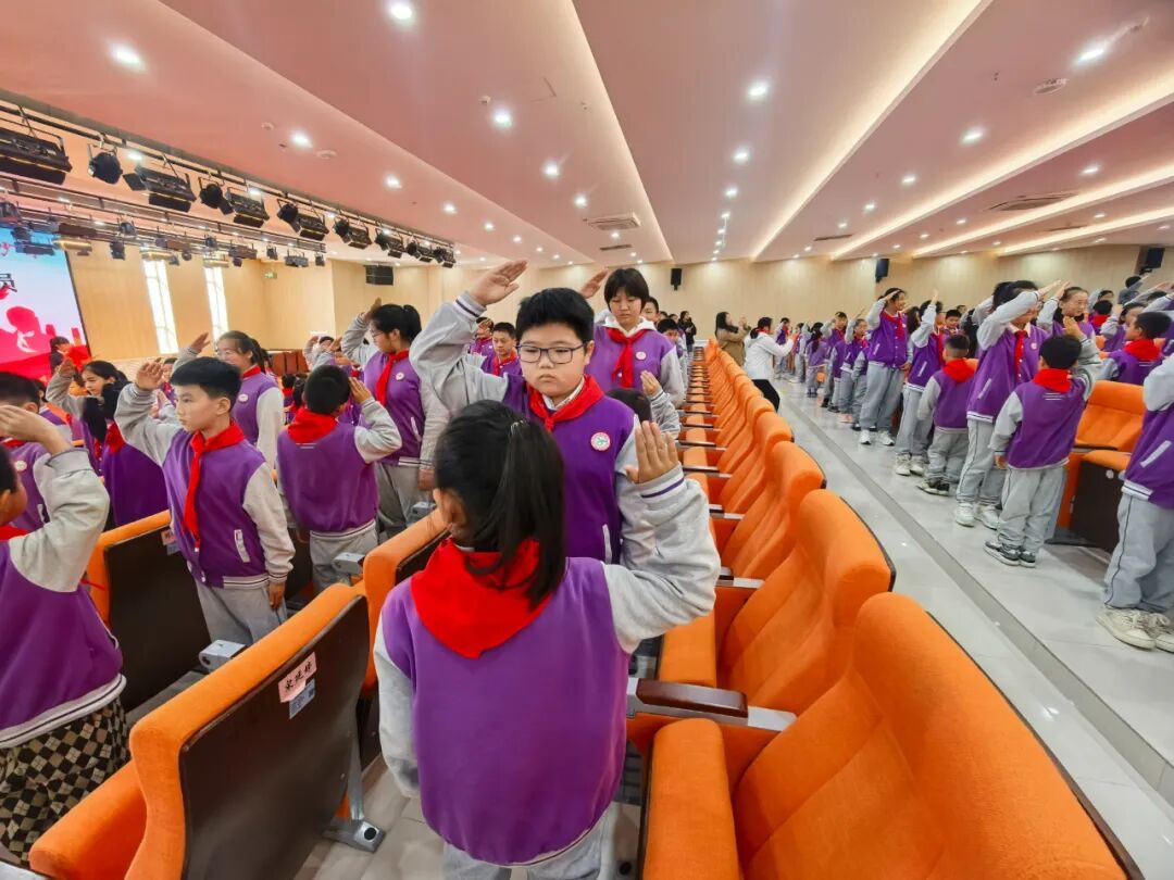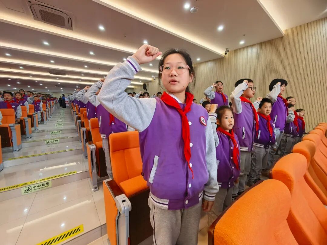 “我是中国少年先锋队队员。我在队旗下宣誓:我热爱中国共产党,热爱祖国,热爱人民……” 新队员代表高举右拳,用铿锵有力的声音领誓,全体新队员随之举起右拳,拳心朝向左侧前方,稚嫩的童声中饱含着对党的忠诚与为共产主义事业贡献力量的决心,誓言声响彻整个报告厅。