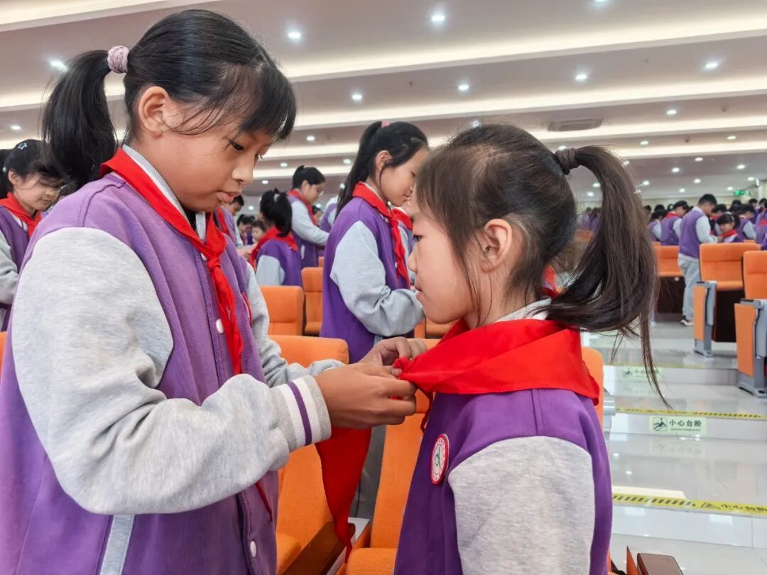 伴着《大梦想家》的轻快旋律,新队员们迈着稚嫩却坚定的步伐有序入场。早已等候在两侧的老队员们,提前将红领巾对折整理好,双手捧着走向新队员。佩戴时,老队员们仔细将红领巾绕过新队员的脖颈,认真调整两角长度,确保对齐衣领,新队员们则轻轻低头配合,戴好后还会下意识地用手抚摸胸前的红领巾,自豪与喜悦的笑容在脸上绽放。此时,《红领巾之歌》的旋律响起,现场氛围被推向高潮,新队员代表还上台发表演讲,用真诚的语气讲述自己对少先队的向往与未来的承诺。