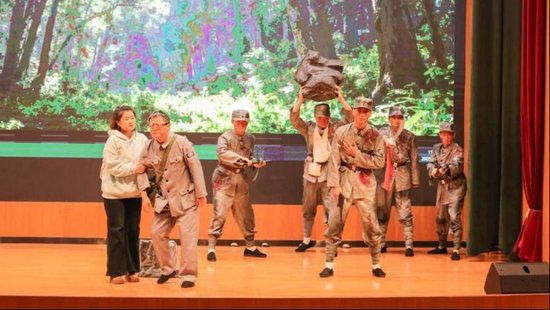 山东管理学院艺术学院教师路遥及学生秦蕊蕊、张海祥、张弛、张浩、高志光、尚琪奥共同表演小戏小剧《庆功酒》。该剧以一位85 岁老兵重返新时代马岭村追寻战友足迹为线索,艺术化再现抗战时期 “共饮庆功酒” 的壮烈约定,深情展现革命先辈的崇高理想信念和爱国主义情怀,进一步厚植爱党爱国爱社会主义情感。