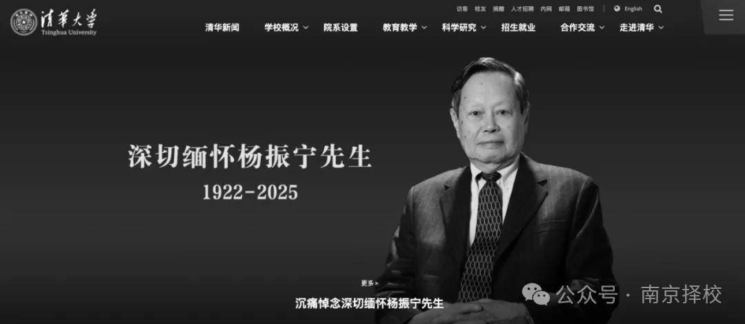 记者注意到,18日,清华大学官网发布了《沉痛悼念深切缅怀杨振宁先生》一文,学校官网也已转为黑白。