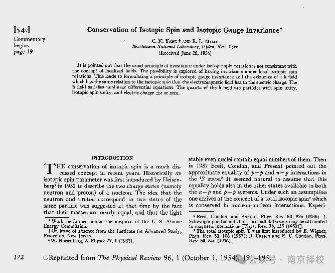 1954年杨振宁与米尔斯关于“非阿贝尔规范场”的论文