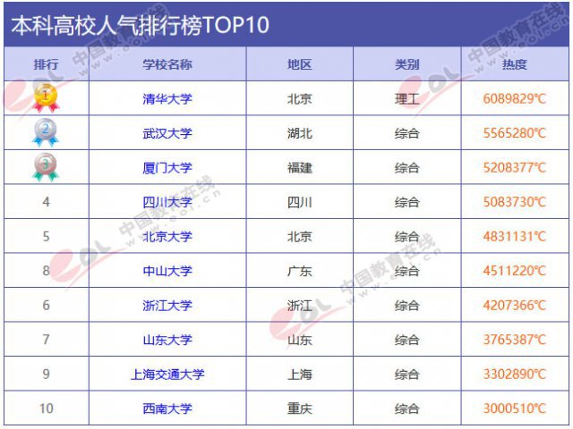 8 月 10 日,中国教育在线发布 "2016 年中国最具人气大学排行榜 ( 7 月 ) ",清华大学排名上升至第一位。武汉大学、厦门大学回落至第二、三位。7 月份专科上榜高校前三甲分别是天津职业大学、宁波职业技术学院、武汉职业技术学院